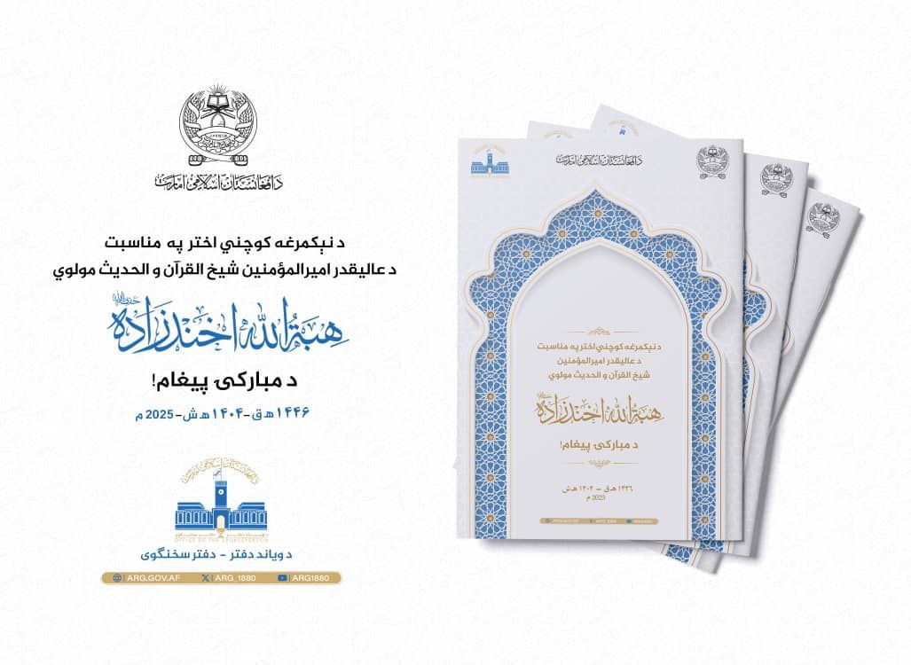 د نېکمرغه کوچني اختر په مناسبت د عالیقدر امیرالمؤمنین شیخ القرآن و الحدیث مولوي هبة ﷲ اخند زاده صاحب حفظه ﷲ تعالی د مبارکۍ پیغام!